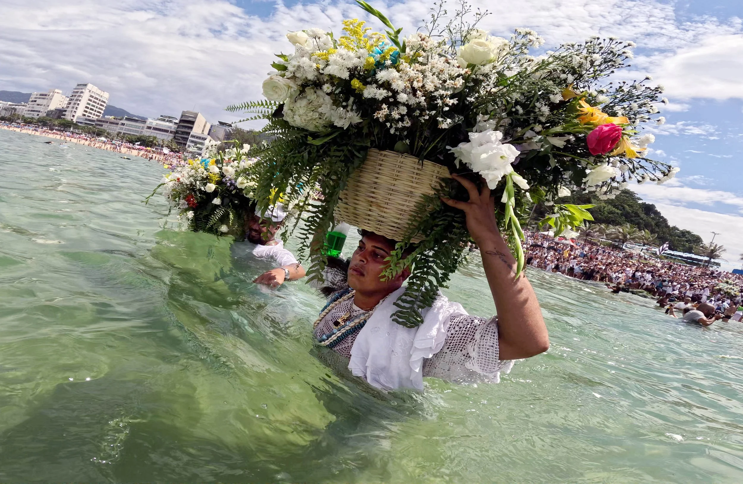 February 2, 2025—Practitioners of the Afro-Brazilian Umbanda faith enter the sea with offerings as thousands of supporters gathered on Ipanema Beach in Rio de Janeiro for the annual February 2 celebration of Iemanjá. This tradition honors the Goddess of the Sea with offerings, prayers, and acts of devotion, seeking blessings for the year ahead.