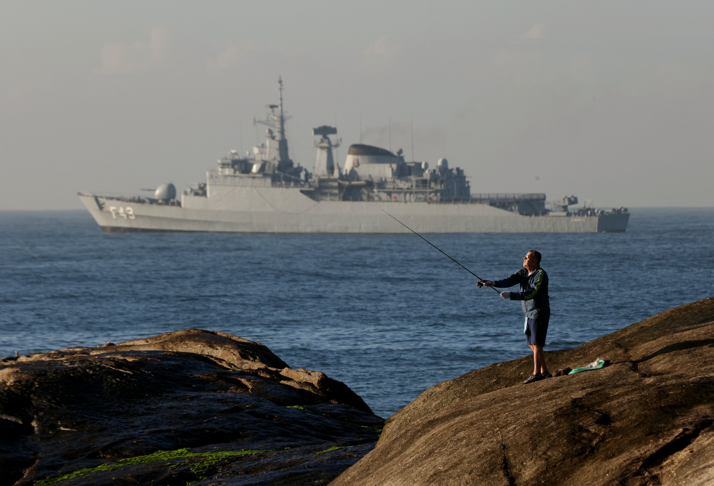July 5, 2025—A fisherman casts his line off Ipanema Beach as the Brazilian Navy frigate Independência (F-43), a Niterói-class vessel, looms in the background. Leaders and delegates gather in Rio de Janeiro for the BRICS Summit, hosted by Brazil as it assumes the 2025 presidency of the group. The expanded bloc now includes 11 major emerging economies—South Africa, Saudi Arabia, Brazil, China, Egypt, United Arab Emirates, Ethiopia, Indonesia, India, Iran, and Russia. Over 35 international delegations are expected to attend the event.