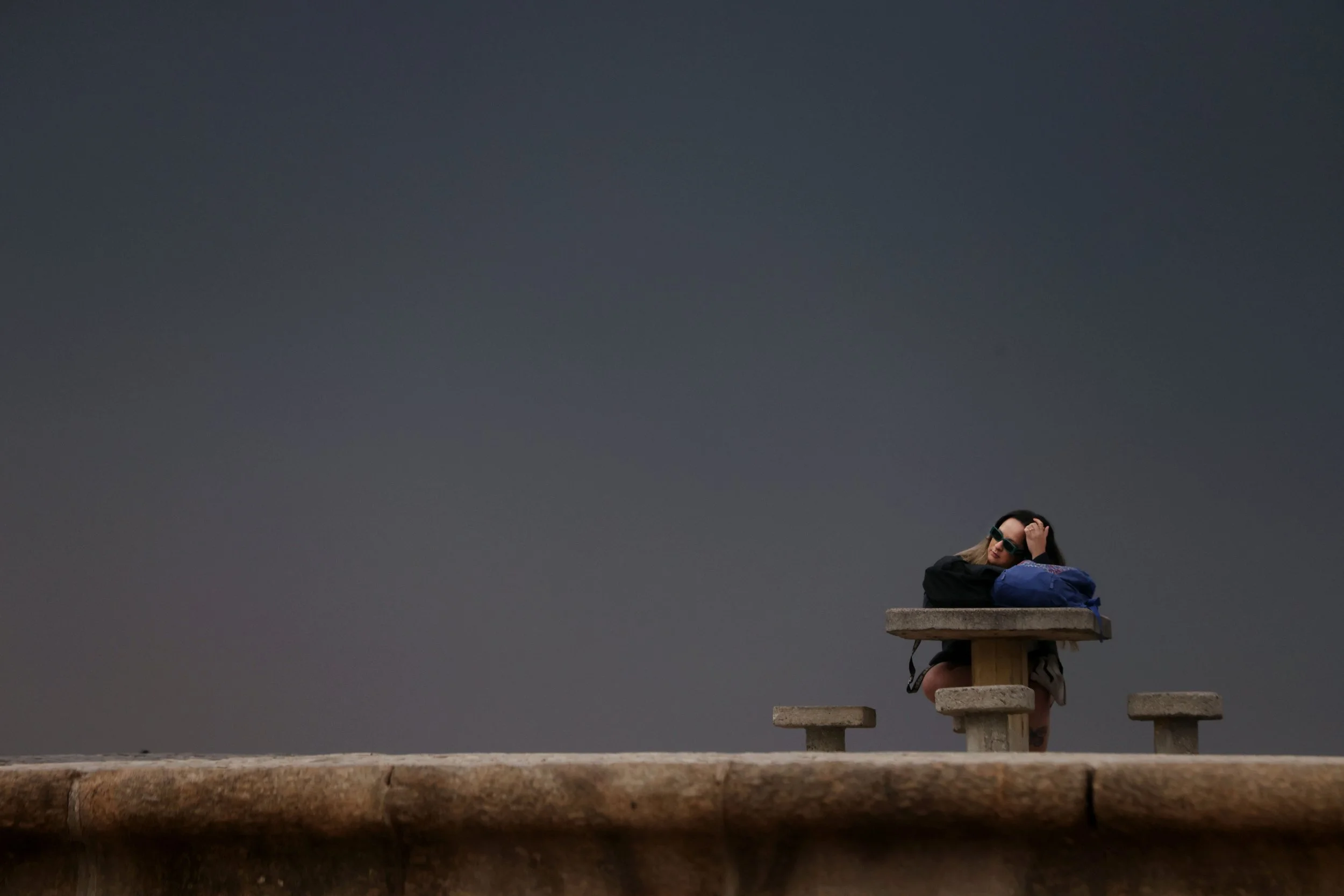 July 24, 2025—A woman sits alone on a stone bench along the Arpoador boardwalk in Rio de Janeiro as dark storm clouds gather overhead. The approaching storm brought winds and signaled a shift in the city's typically sunny winter weather.