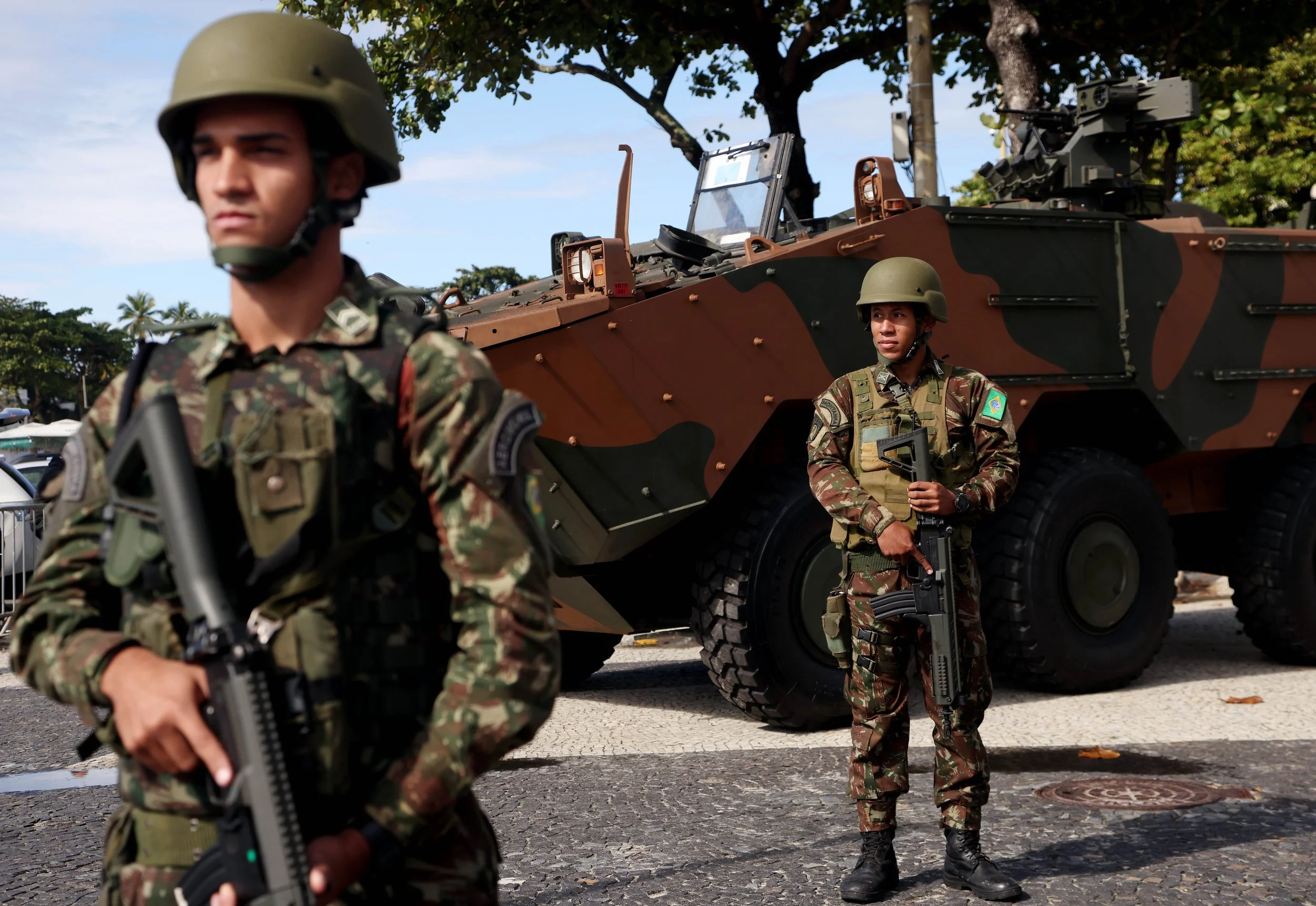 July 4, 2025—Brazilian Army soldiers stand guard on Avenida Atlântica in Copacabana, positioned in front of a VBTP-MR Guarani armored personnel carrier, a domestically developed military vehicle. Leaders and delegates gather in Rio de Janeiro for the BRICS Summit, hosted by Brazil as it assumes the 2025 presidency of the group. The expanded bloc now includes 11 major emerging economies—South Africa, Saudi Arabia, Brazil, China, Egypt, United Arab Emirates, Ethiopia, Indonesia, India, Iran, and Russia. Over 35 international delegations are expected to attend the event.