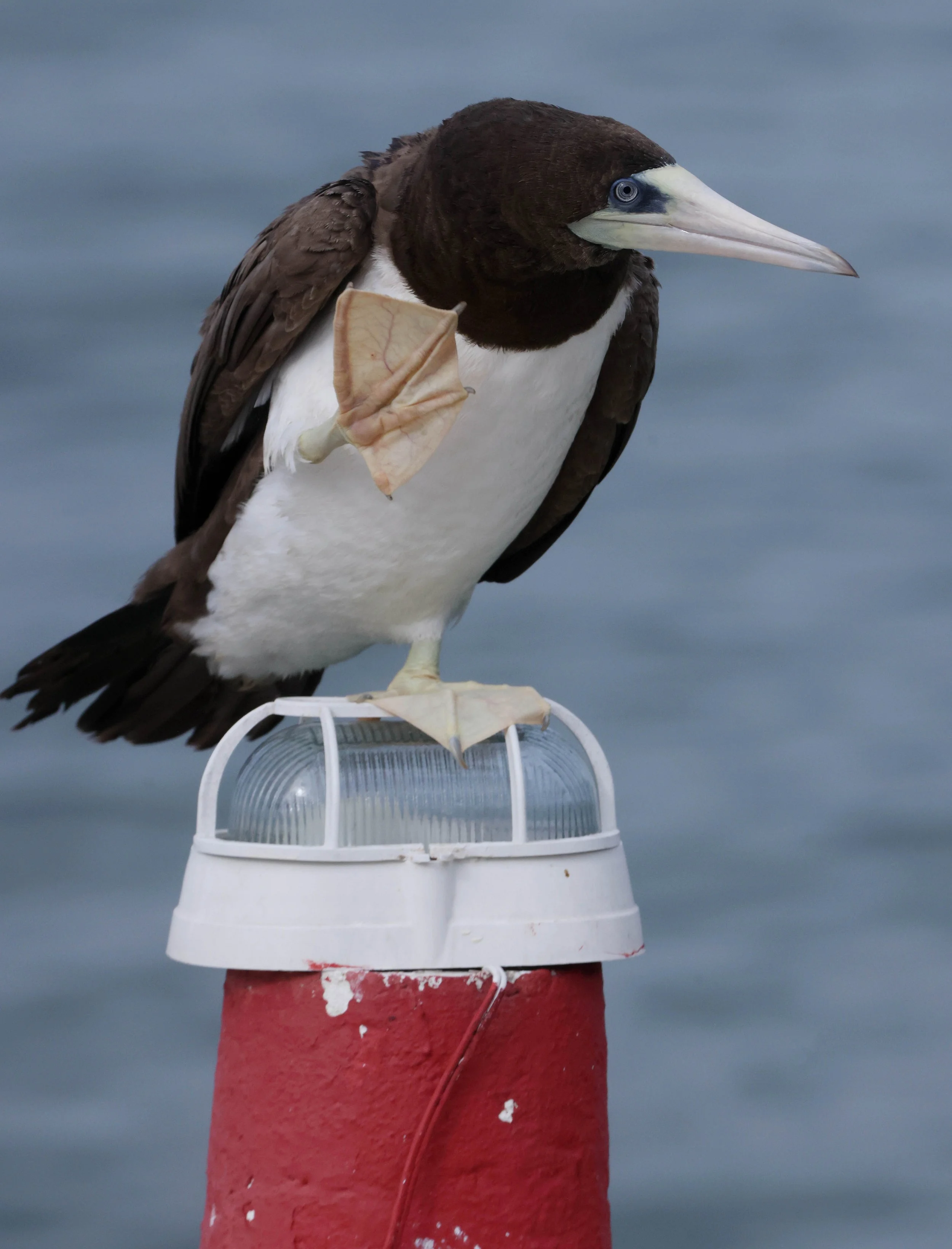 December 4, 2025—A Brown Booby itches his ear as he perches confidently on a dock light at Copacabana Beach, calmly surveying the shoreline as waves roll in behind it. Known for their agile diving skills, Brown Boobies can plunge spectacularly into the ocean to catch fish. These tropical seabirds are often seen resting on coastal structures, making this relaxed visitor a classic sight along Brazil’s shoreline.