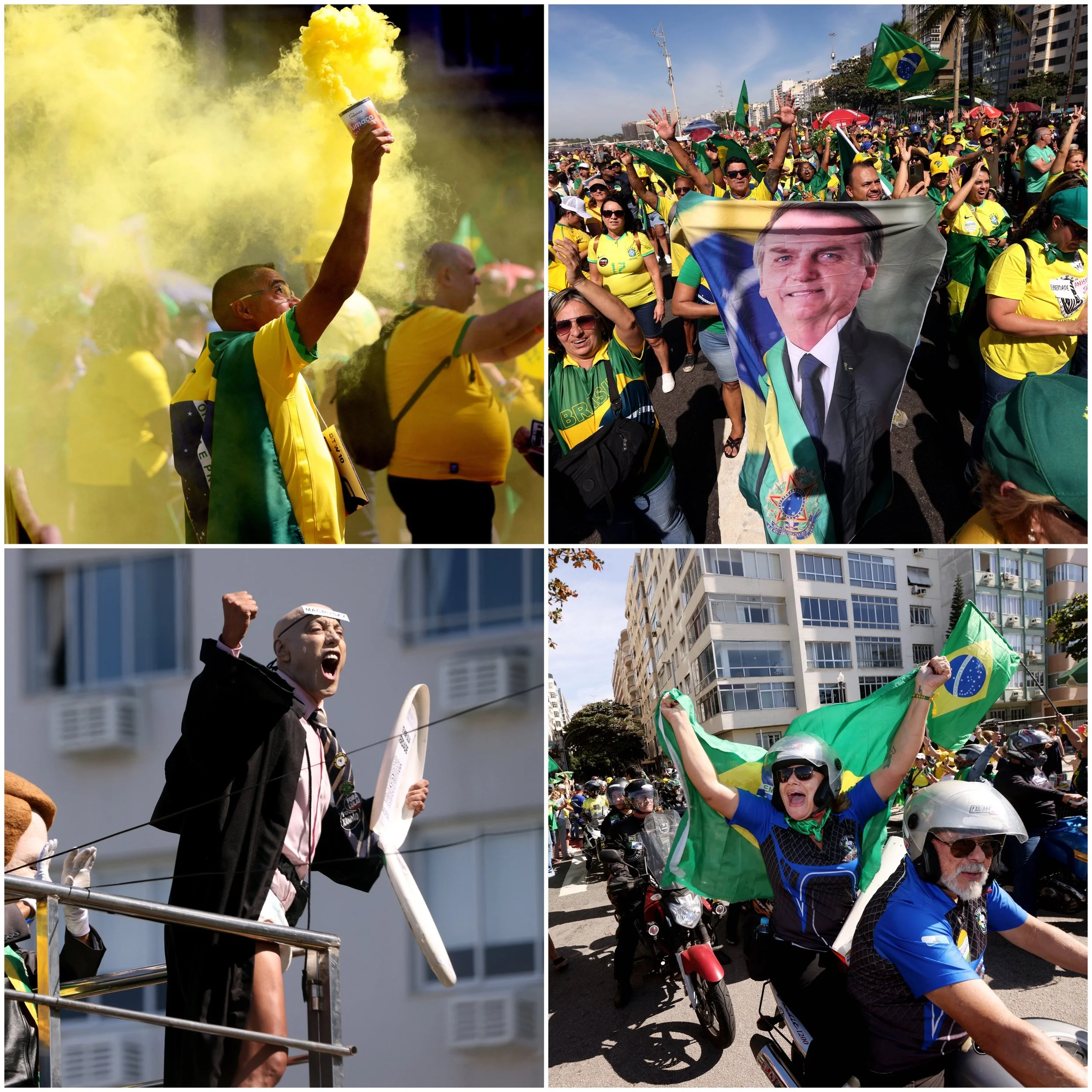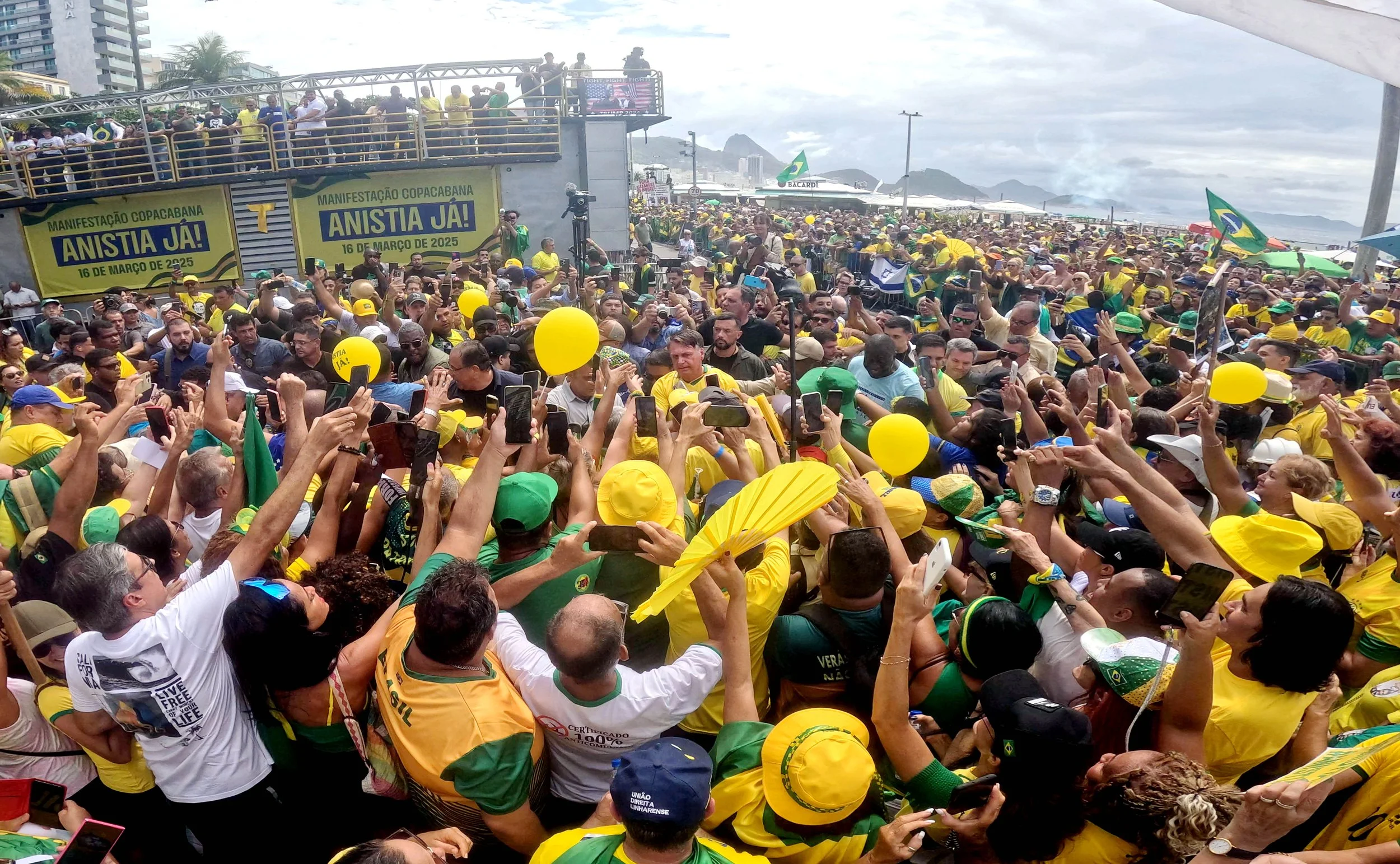 March 16, 2025—Former Brazilian President Jair Bolsonaro, c, makes his entrance surrounded by thousands of supporters before speaking on the sands of Copacabana Beach in Rio de Janeiro at a protest aimed at pressuring the National Congress to approve a controversial bill that would grant amnesty to those jailed for their involvement in the January 8, 2023, attacks in Brasília. The rally comes just nine days before Brazil’s Supreme Court is scheduled to hold a crucial March 25 hearing at which a five-justice panel will decide whether Bolsonaro faces trial for alleged coup plotting. Last month, Bolsonaro was formally charged with his role in a failed plot to block his left-wing successor, Luiz Inácio Lula da Silva, from taking office following his victory in the October 2022 elections.