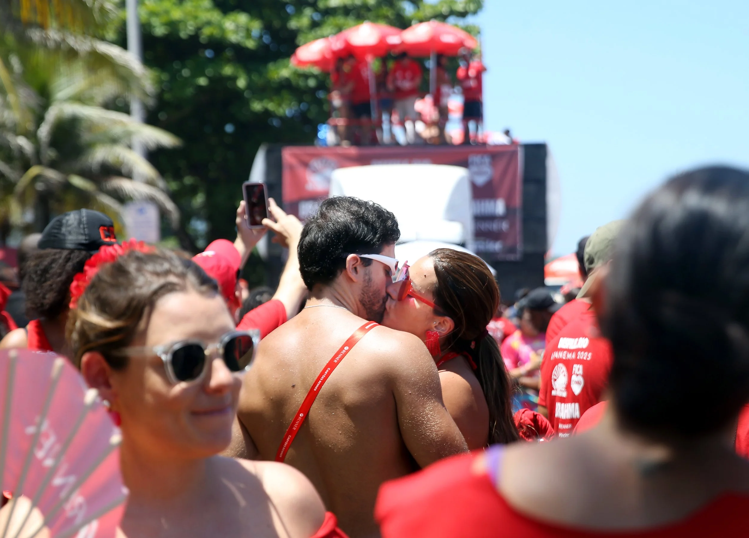 February 16, 2025—A couple kisses during the Bloco ‘Se Não Quiser Me Dar Me Empresta,’ joining hundreds who came out to the Ipanema waterfront for the street carnival bloco founded in 2008 by residents of Ipanema, Rio de Janeiro. Each bloco has its own anthem, blending traditional tunes with contemporary hits. In 2025, Rio de Janeiro’s street carnivals will feature 482 official blocos, with over 6 million people enjoying the parties.