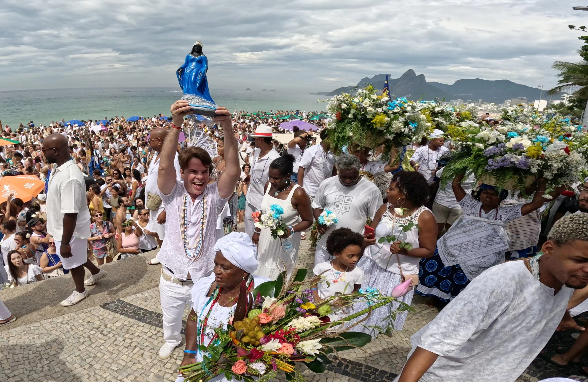 February 2, 2025—Marcos André Carvalho holds a statue of Iemanjá, joining thousands of practitioners of the Afro-Brazilian Umbanda faith and their supporters joined in a procession to the ocean gathering on Ipanema Beach in Rio de Janeiro for the annual February 2 celebration of Iemanjá. This tradition honors the Goddess of the Sea with offerings, prayers, and acts of devotion, seeking blessings for the year ahead.