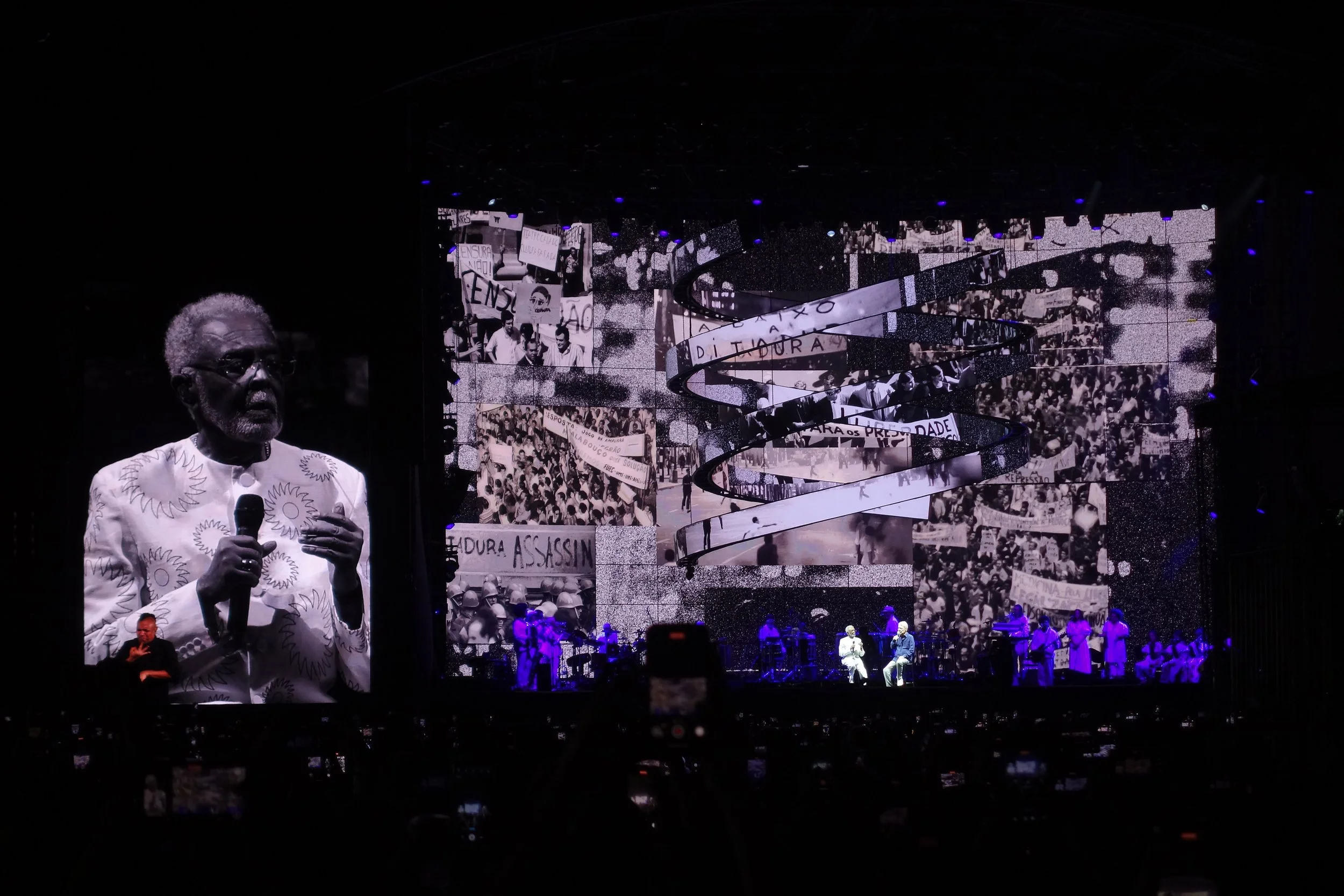 June 1, 2025—As part of his farewell Tempo Rei tour, Gilberto Gil welcomed Chico Buarque for a powerful duet of “Cálice.” This song that they co-wrote in the 70’s was a symbol of resistance against the dictatorship, still echoes with strength and poetry. This haunting anthem, once silenced under the military regime, still echoes today with fierce urgency and poetic strength. The title “Cálice” is a homophone for “cale-se,” which means “shut up” in Portuguese, transforming a religious symbol, the chalice, into a metaphor for censorship and repression. The repeated plea, “Pai, afasta de mim esse cálice” (“Father, take this chalice away from me”) echoes the lament of Jesus, but here it becomes a cry against authoritarian forces that sought to silence an entire people. To witness these two legends together, in such a meaningful moment, was a profound privilege. Brazilian music doesn’t just captivate, it protests, remembers, and resists.