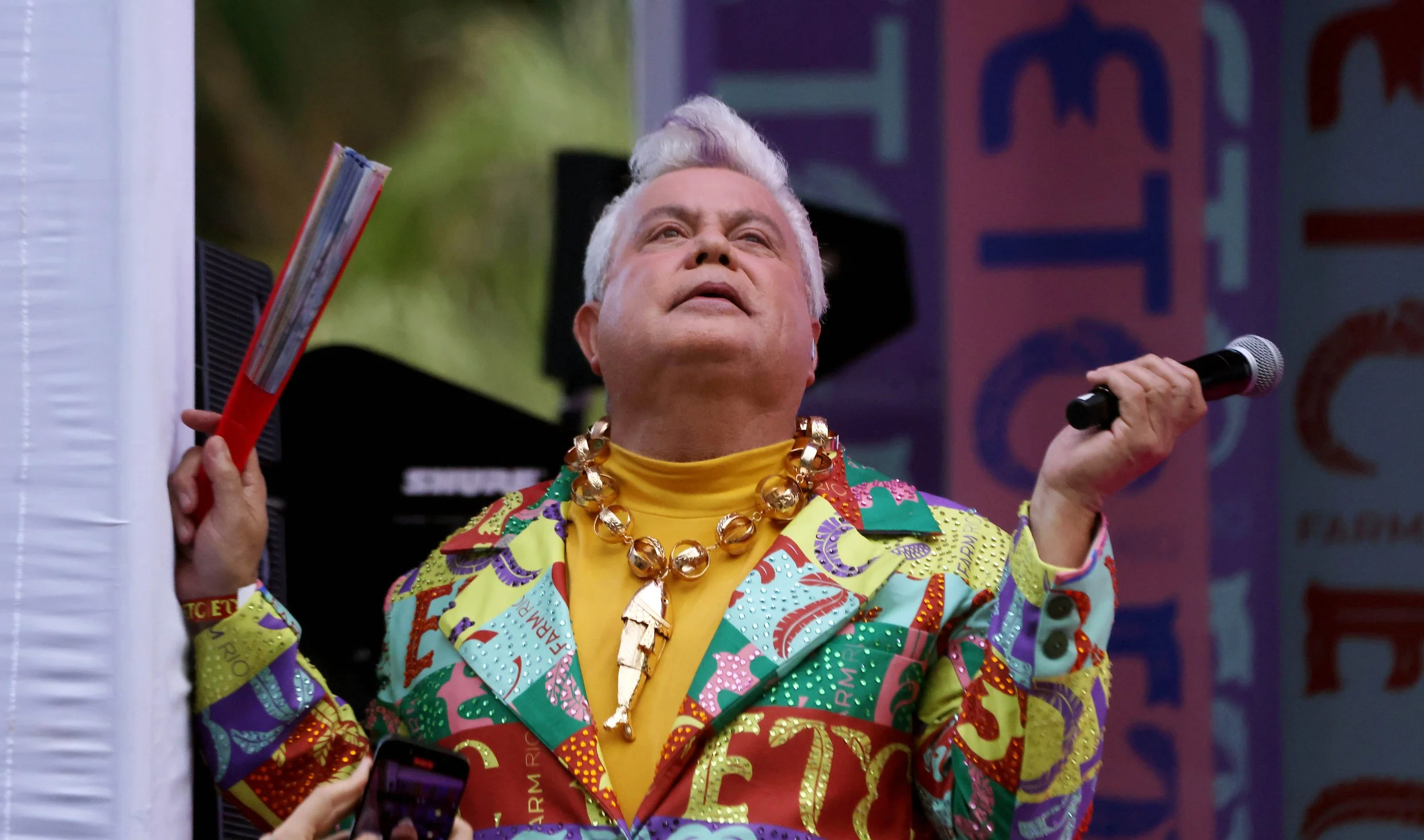 August 3, 2025—Senator FLAVIO BOLSONARO holds a phone to a microphone so supporters at a rally on Copacabana beach can hear a live message from his father, former President Jair Bolsonaro As Bolsonaro's voice echoed through the crowd, supporters aboard a trio eletrico recorded the moment on their phones, aiming to spread it across social media. The appearance, despite a court ban on social media and political engagement, led Brazil's Supreme Court to order Bolsonaro to house arrest the following day. Justice Alexandre de Moraes called the act a clear violation of restrictions imposed amid ongoing investigations into an alleged coup attempt.