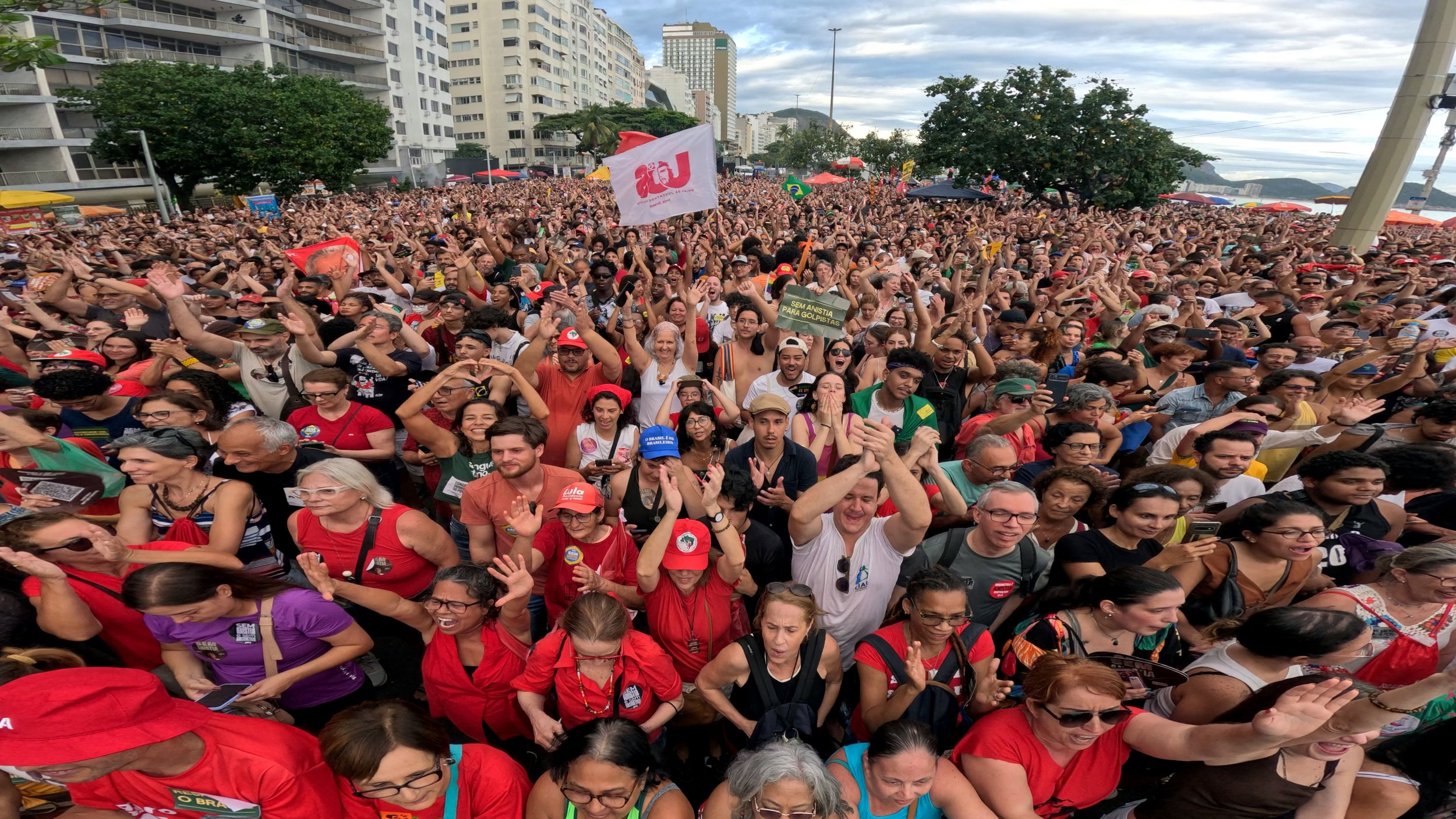 December 14, 2025—Thousands of protesters filled Copacabana during Brazil’s nationwide ‘No Amnesty’ demonstrations, calling for full accountability for those involved in the January 8 attacks on the country’s democratic institutions. The Rio de Janeiro march, one of dozens held across Brazil, brought together unions, student groups, and civil-society organizations opposed to legislation they say could ease penalties and enable political amnesty.