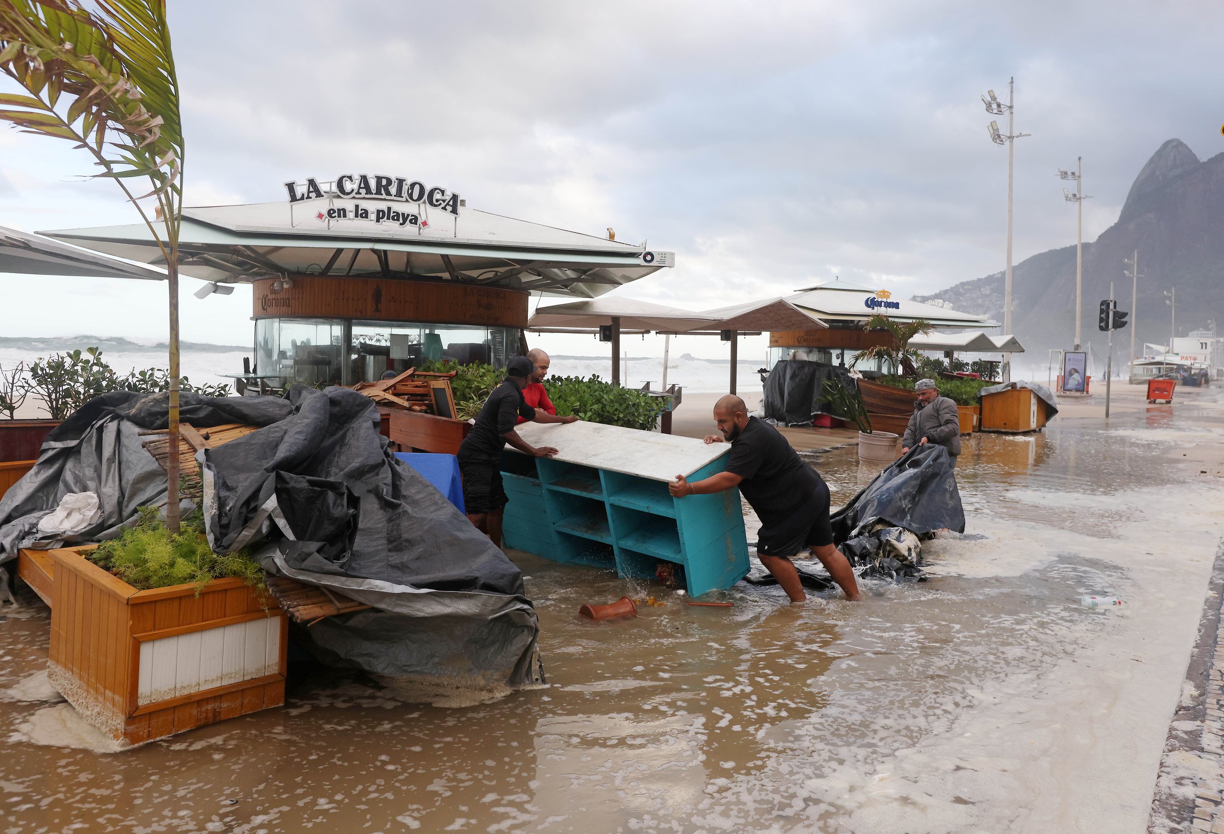 July 29, 2025—Workers from the La Carioca kiosk attempt to save a cabinet that was washed away in the aftermath of a powerful winter storm that sent ocean waves surging over the beach in a rare storm surge event. Rio de Janeiro municipal cleaning crews from Comlurb were dispatched to help clean up the flooding along the Leblon boardwalk and Delfim Moreira Avenue. The violent surge caused significant damage to several beachfront kiosks and scattered debris across the normally bustling coastline."