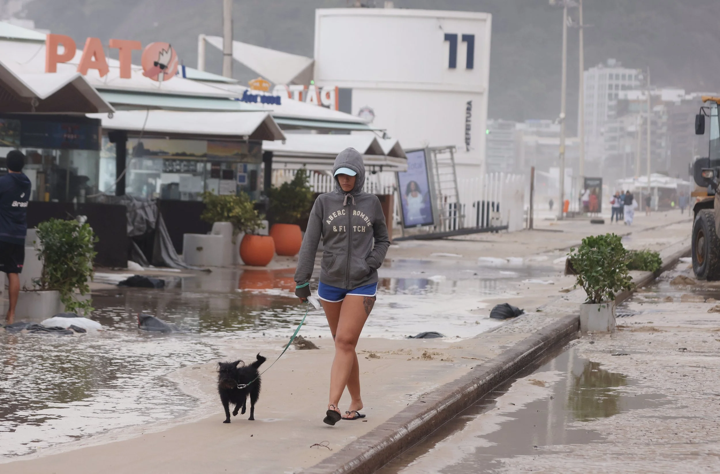 July 29, 2025—Isabela Moura and her dog Goku walk along a flooded Delfim Moreira Avenue, as Rio de Janeiro municipal cleaning crews from Comlurb were dispatched to clean up the aftermath of a powerful winter storm that sent ocean waves surging over the beach in a rare storm surge event, flooding the Leblon boardwalk and Delfim Moreira Avenue. The violent surge caused significant damage to several beachfront kiosks and scattered debris across the normally bustling coastline.