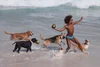 A young man tosses a coconut while playing catch with a pack of eager beach dogs in the surf at Arpoador Beach in Rio de Janeiro, Brazil. Along Rio’s famous shoreline.