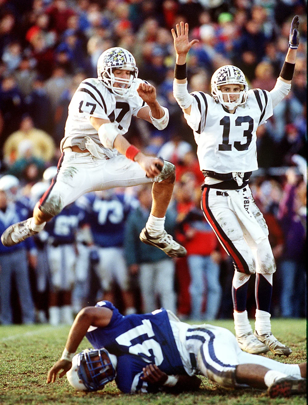 December 1, 1990—Randolph High school holder Eric Schaub & Mike Groh celebrate Groh's 37 yrd FG with 0:01 seconds left in the game as the ball cleared the uprights at Woodman Field in Montclair, NJ.